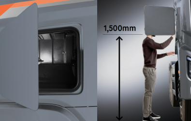 방패 형상의 전면부는 강인하면서도 세련된 인상을 주며, LED 리어 콤비램프, 순차 점등 방향지시등, 퍼들 램프 등으로 시인성과 감각을 모두 만족시킵니다. 적재함에는 스웨덴 하독스(Hardox) 고강도 강판이 적용되어 내마모성과 방청성이 우수하고, 복합재 리어 게이트가 적용돼 무게는 줄이고 내구성은 높였습니다. 유로6D 배기가스 규제를 충족하는 정화 시스템도 기본 탑재돼 환경 규제 대응에도 문제가 없습니다.