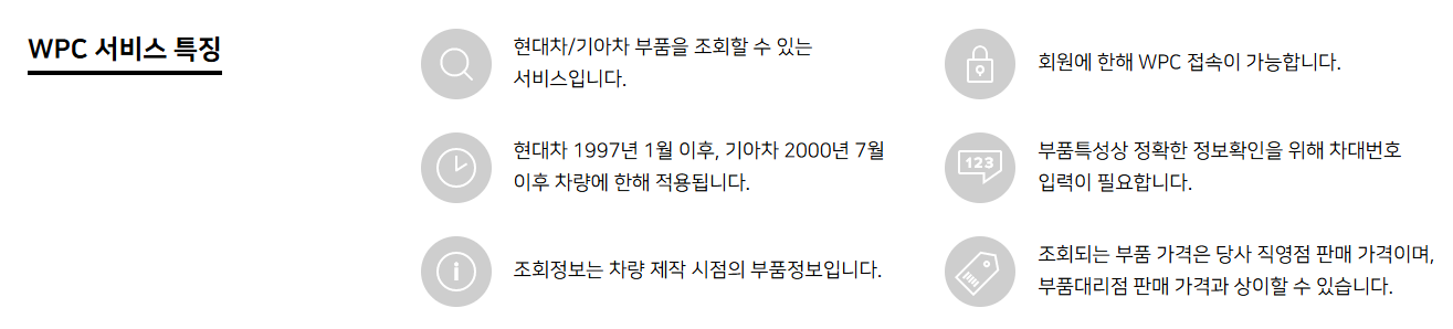 특히 옵션이나 연식, 엔진 사양에 따라 부품이 세분화되는 경우가 많기 때문에, 정확한 부품이 필요한 경우에는 반드시 WPC 검색을 이용하는 것을 추천드립니다.