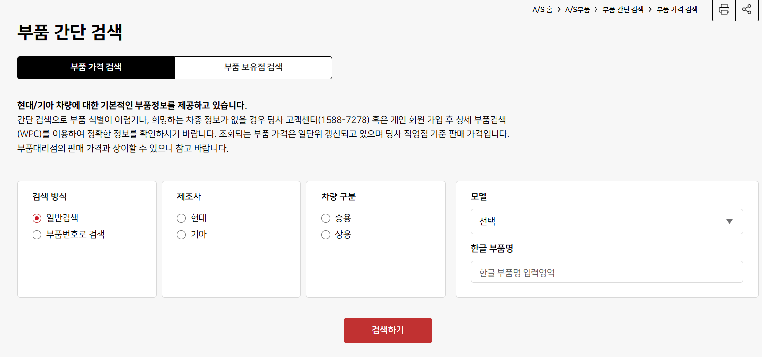 - 일반검색: 제조사(현대 또는 기아), 차량 구분(승용/상용), 모델명, 부품명을 입력해 검색하는 방식입니다.