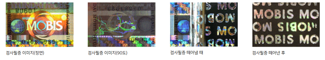 포장박스에 홀로그램 검사필증이 부착되어 있으며, 떼어내면 'MOBIS'라는 문자가 남도록 설계되어 있어 복제가 어렵습니다.