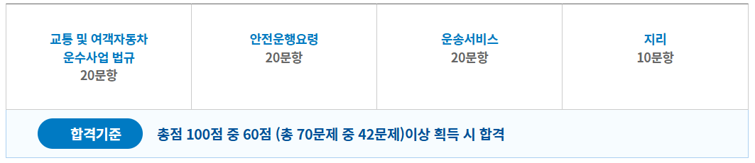 합격 기준은 총점 100점 중 60점 이상이며, 즉 70문항 중 42문항 이상 정답을 맞춰야 합격입니다. 개인택시운전 자격시험 접수 조건 취득방법 문제 총정리에서 가장 중요한 팁 중 하나는, 네 과목 모두 고르게 점수를 획득해야 안정적으로 합격할 수 있다는 점입니다.