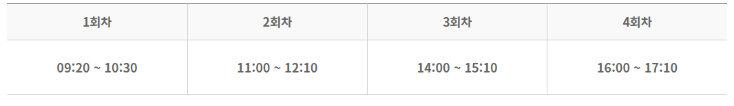시험일정은 지역별로 상이할 수 있으며, 하루 최대 4회차(09:20, 11:00, 14:00, 16:00)로 나뉘어 진행됩니다.