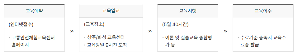 교육은 오전 9시까지 입소해야 하며, 이론과 실습을 병행합니다. 수료 후 1년 이내에 면허 양수 절차를 진행해야 하며, 기한이 지난 경우 재교육을 받아야 합니다.