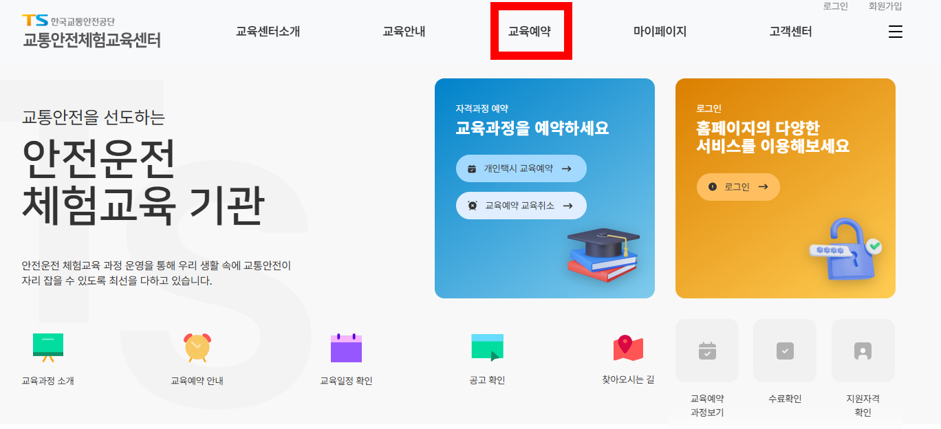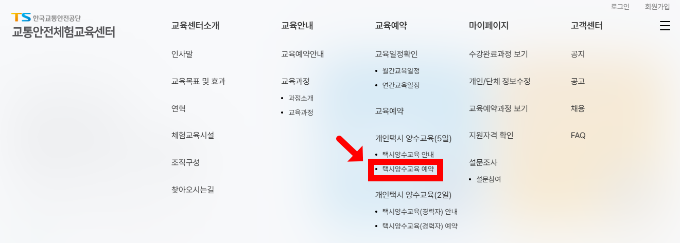 개인택시 양수교육은 한국교통안전공단의 교통안전체험교육센터 홈페이지에서 예약해야 합니다. 아래 절차를 참고해 주세요.