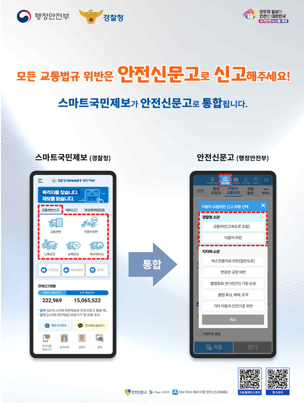 과거에는 경찰청의 ‘스마트국민제보’와 행정안전부의 ‘안전신문고’가 중복 운영되었지만, 2025년 4월을 기점으로 교통 위반 신고 기능이 완전히 통합되어 안전신문고에서만 신고 가능합니다.