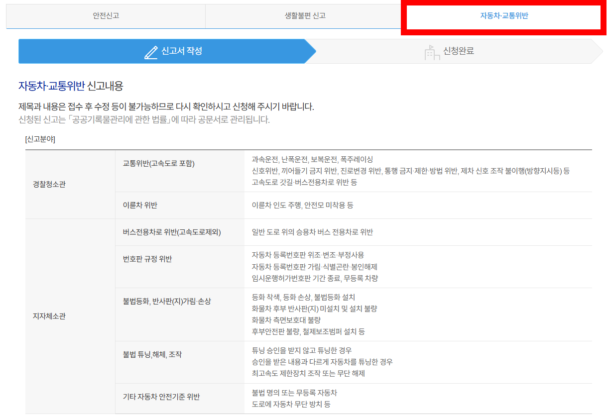 위반 일시, 장소, 유형을 정확히 기입하고 영상 또는 사진 파일을 첨부합니다. 위반 상황을 간단히 설명하면 처리 속도가 빠를 수 있습니다. - 제출 및 결과 확인