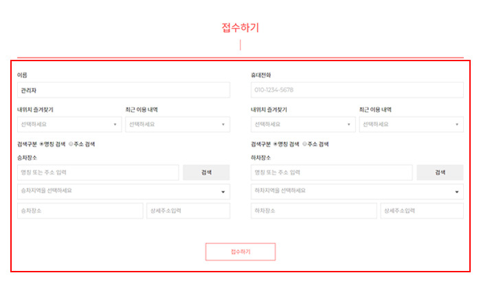 접수화면에 들어가면 출발지와 목적지를 입력하는 칸이 나온다. 이때 세 가지 방식으로 위치를 입력할 수 있다. 첫 번째는 ‘내 위치 즐겨찾기’ 기능을 이용해 미리 저장된 장소를 불러오는 방식이다. 두 번째는 ‘최근 이용 내역’에서 과거 사용 기록을 참고해 선택하는 방법이다. 마지막으로 주소 또는 시설명 등 명칭을 직접 검색하여 입력할 수도 있다.