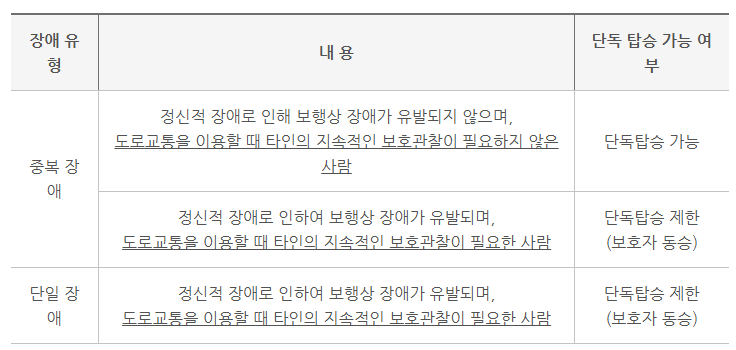 • 정신적 장애(지적·자폐성·정신장애 등): 보행에 큰 어려움이 없고, 도로교통 이용 시 타인의 지속적인 보호가 필요 없는 경우에는 단독 탑승이 가능합니다. 반대로 보호가 필요하다고 판단되면 보호자 동승이 필수입니다.