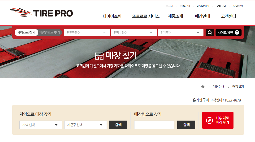 공식 홈페이지 상단 메뉴 중 ‘매장찾기’를 클릭하면 지역별, 매장명 검색이 가능해요. 원하는 지역을 입력하면 지도와 함께 가까운 타이어 전문 매장이 표시되고, 전화번호 및 주소, 영업시간까지 확인할 수 있어요.