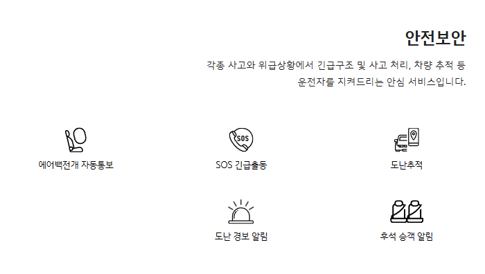 2. 안전보안 – 에어백 전개 자동 통보, SOS 긴급출동, 도난추적, 후석 승객 알림 등