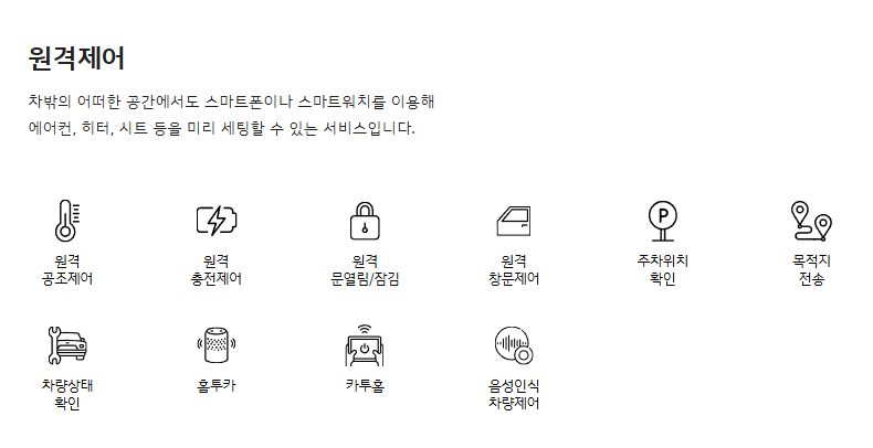1. 원격제어 – 시동, 공조(에어컨·히터), 문 잠금/해제, 창문 제어 등