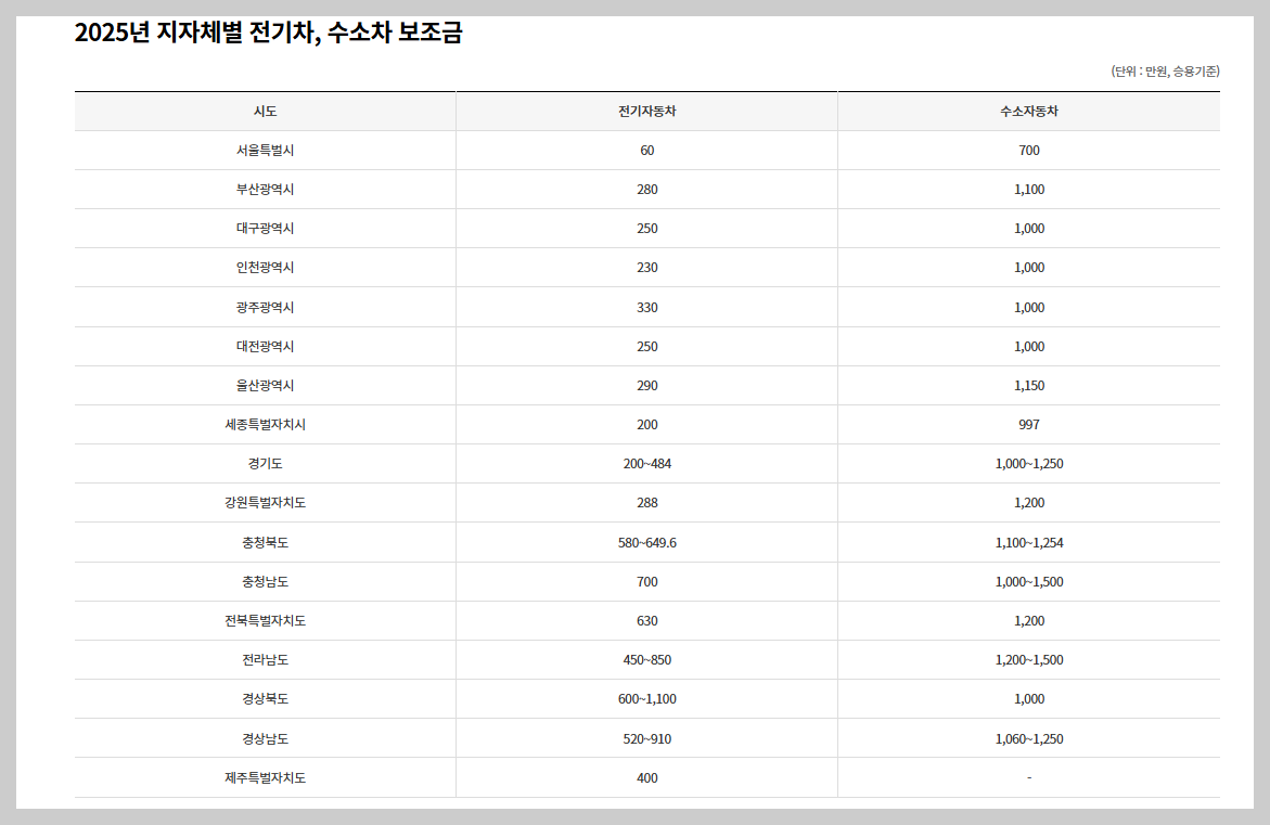 • 지자체 보조금: 지역별 상이, 약 150만 ~ 300만 원 (2025년 기준)
