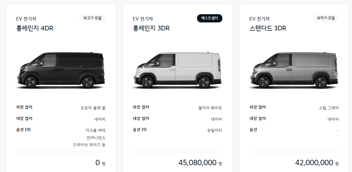 기아 PV5 카고는 스탠다드 롱레인지 두 가지 트림으로 운영되며, 기본 사양에 따라 가격 차이가 발생합니다. 3도어와 4도어 선택이 가능하며, 가격은 동일하되 차량 중량 및 주행거리에서 약간의 차이가 있습니다.