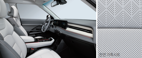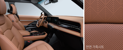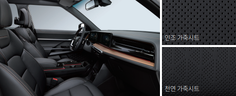 내장 컬러는 블랙 / 그레이 / 브라운 중 선택할 수 있으며, 시트는 기본 인조가죽, 옵션으로 천연가죽(추가 65만 원)이 제공됩니다.