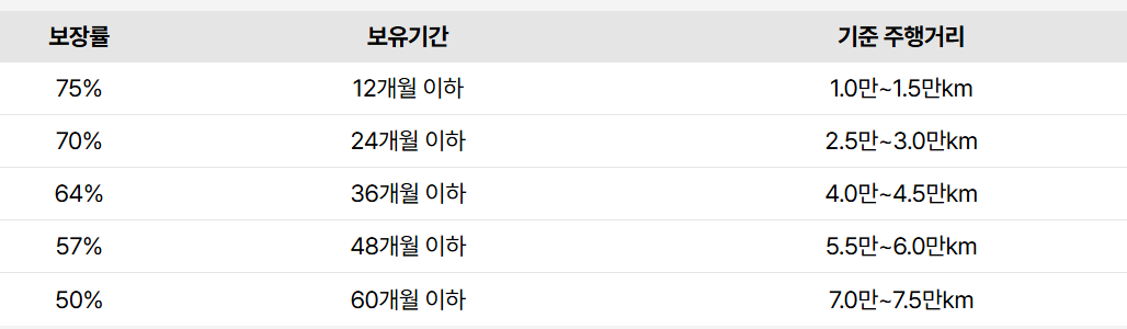 A. 쌍용은 ‘잔존가치 보장 프로그램’을 통해 1~5년 보유 시점별 보장률(최대 75%)을 제공합니다. 단, 주행거리 조건 및 제휴 매매 시스템을 이용할 경우에만 적용됩니다.