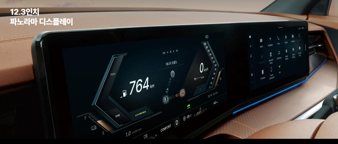 실내는 첨단 디지털 환경과 프리미엄 감성을 모두 충족시켜주는 구성을 보여줍니다. 특히 SE는 일반 트림과 달리 고급 편의사양 대부분이 포함돼 있어, 별도의 옵션 추가 없이도 거의 풀옵션에 가까운 체험이 가능합니다.