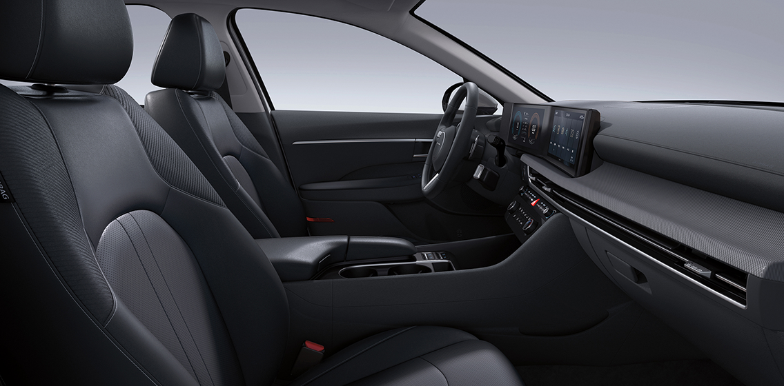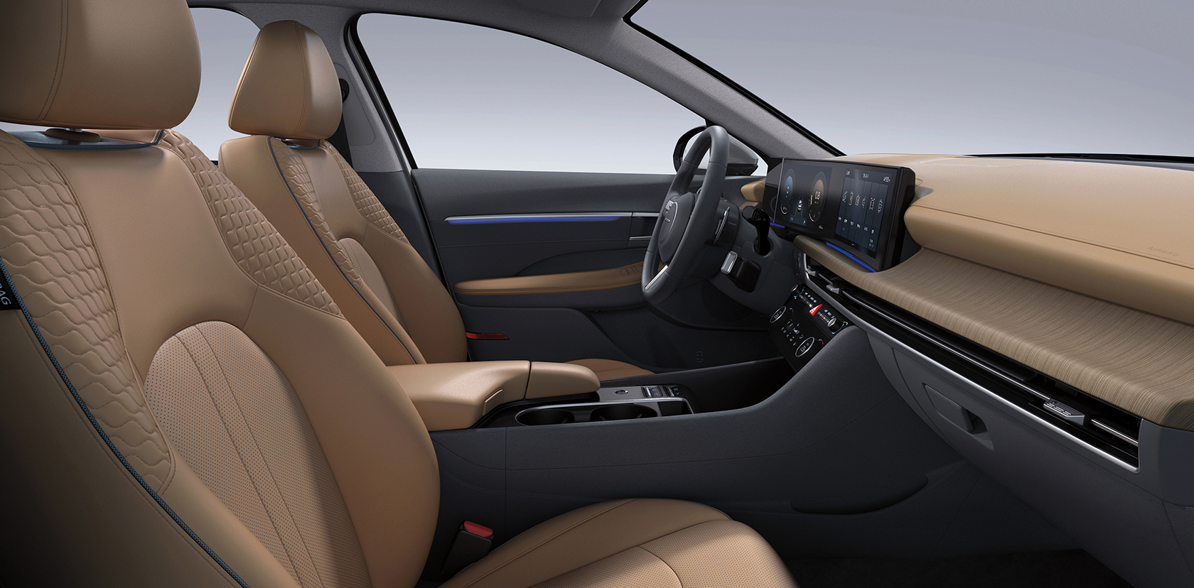 실내는 파노라믹 커브드 디스플레이와 앰비언트 무드램프, 디지털 키2, 지문 인증 시스템 등 첨단 기능으로 구성됩니다. 인포테인먼트 시스템은 12.3인치 디스플레이 오디오 또는 내비게이션 선택이 가능하며, 블루링크, 폰 프로젝션, 무선 업데이트(OTA)까지 지원됩니다.