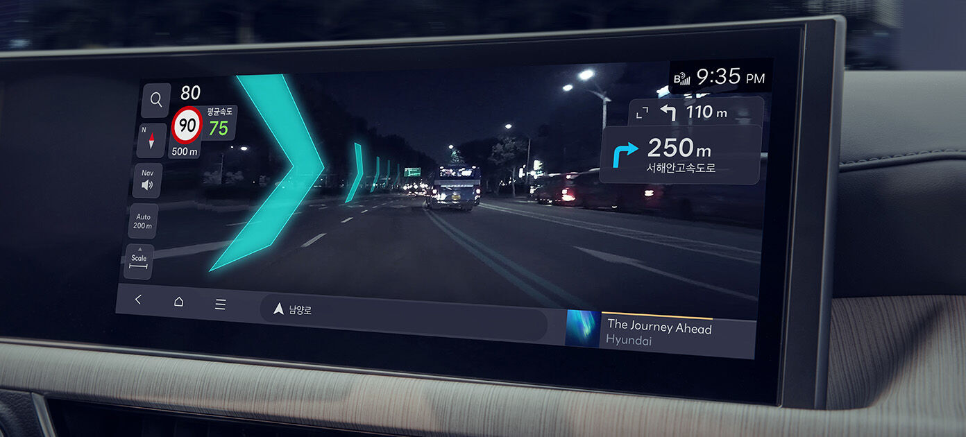 실내는 파노라믹 커브드 디스플레이와 앰비언트 무드램프, 디지털 키2, 지문 인증 시스템 등 첨단 기능으로 구성됩니다. 인포테인먼트 시스템은 12.3인치 디스플레이 오디오 또는 내비게이션 선택이 가능하며, 블루링크, 폰 프로젝션, 무선 업데이트(OTA)까지 지원됩니다.