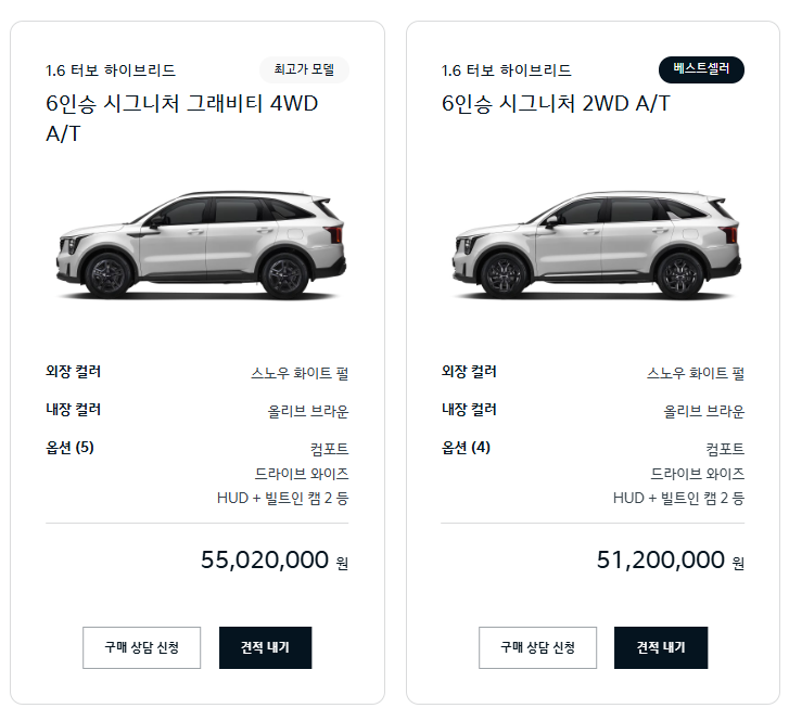 | 시그니처 | 2WD | 6인승 | 약 43,000,000원 | 약 51,200,000원 (컴포트+드라이브와이즈+HUD 등) |