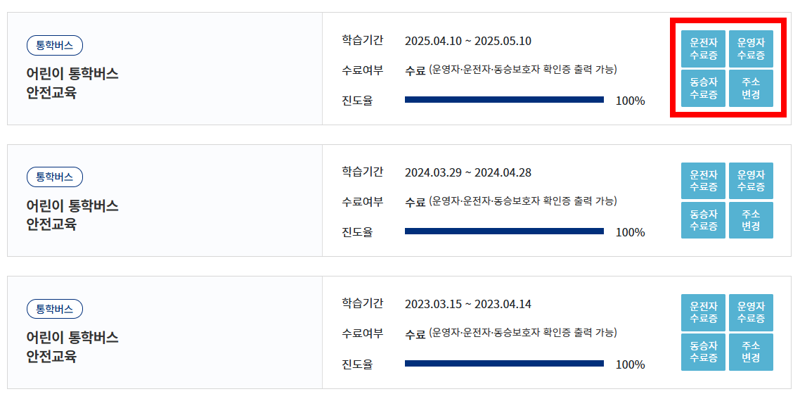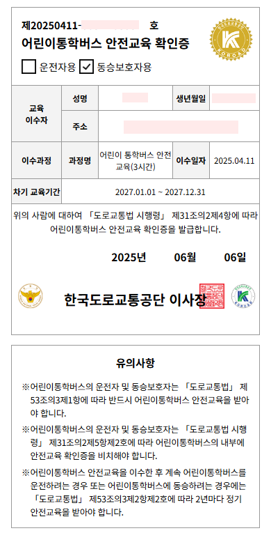 모든 강의와 시험을 완료하면 나의 강의실 ‘수강현황’ 메뉴에서 본인의 수료증(교육확인증)을 확인하고 출력 또는 PDF 저장할 수 있어요. 수료증은 어린이 통학버스를 운영하는 기관, 교육청, 경찰서 등에 제출할 수 있는 공식 문서입니다.