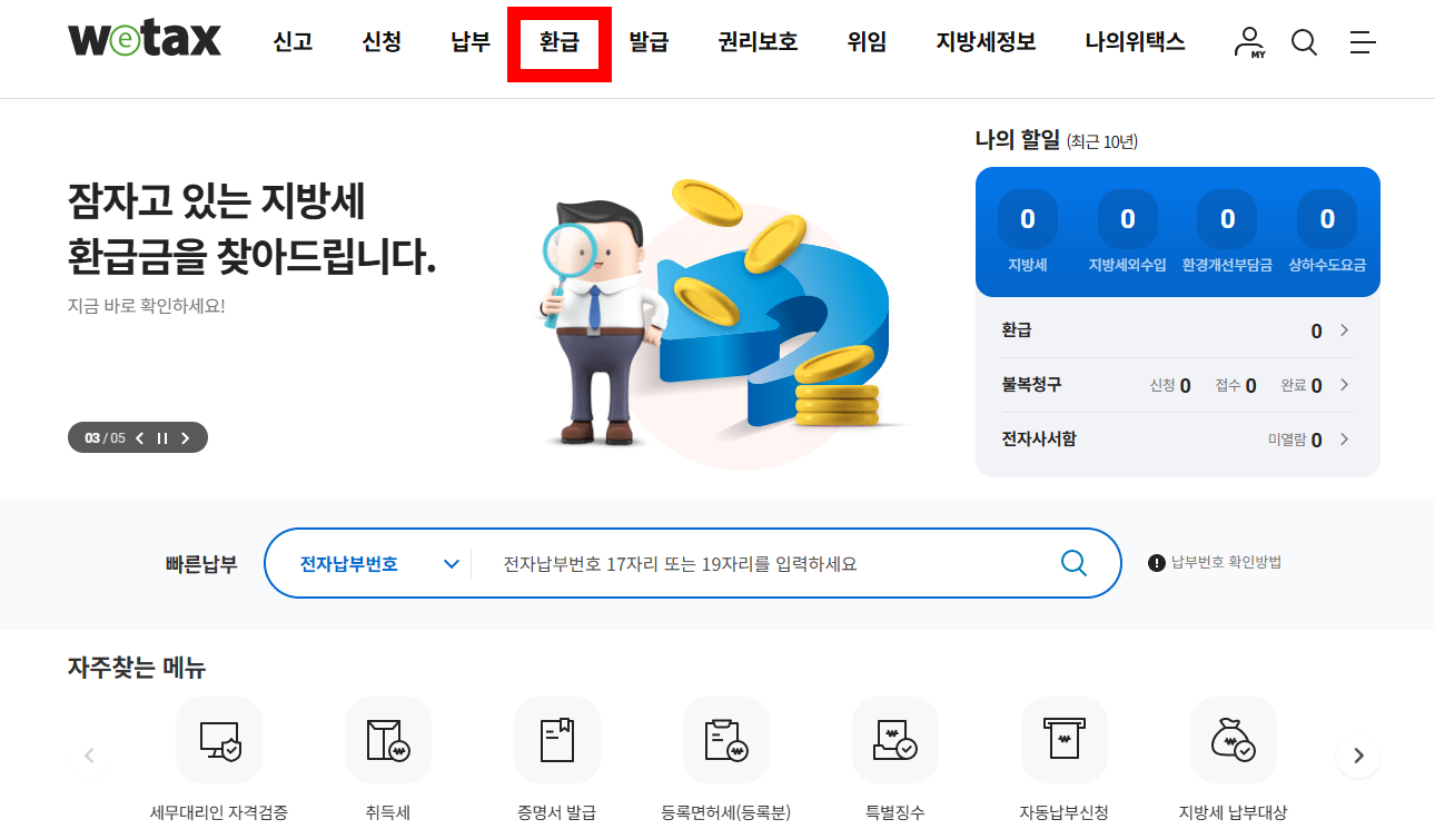 2. 메뉴에서 ‘지방세 환급’ 선택 → ‘환급금 조회 및 신청’ 진입