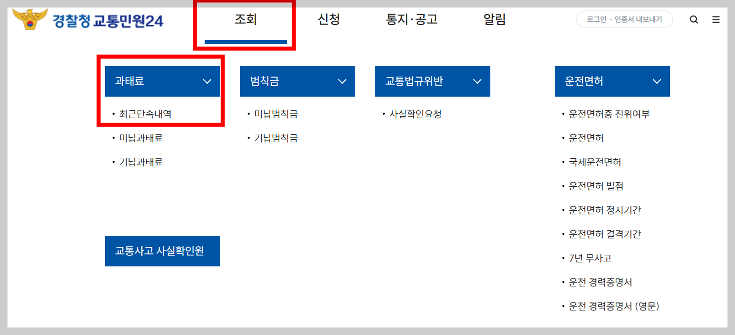 3. 상단 메뉴 ‘조회 > 과태료 > 최근 단속 내역 조회 ’ 클릭