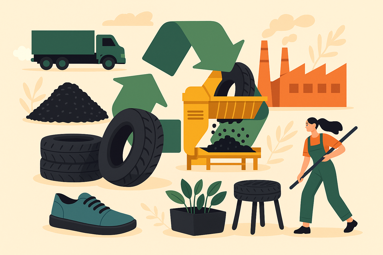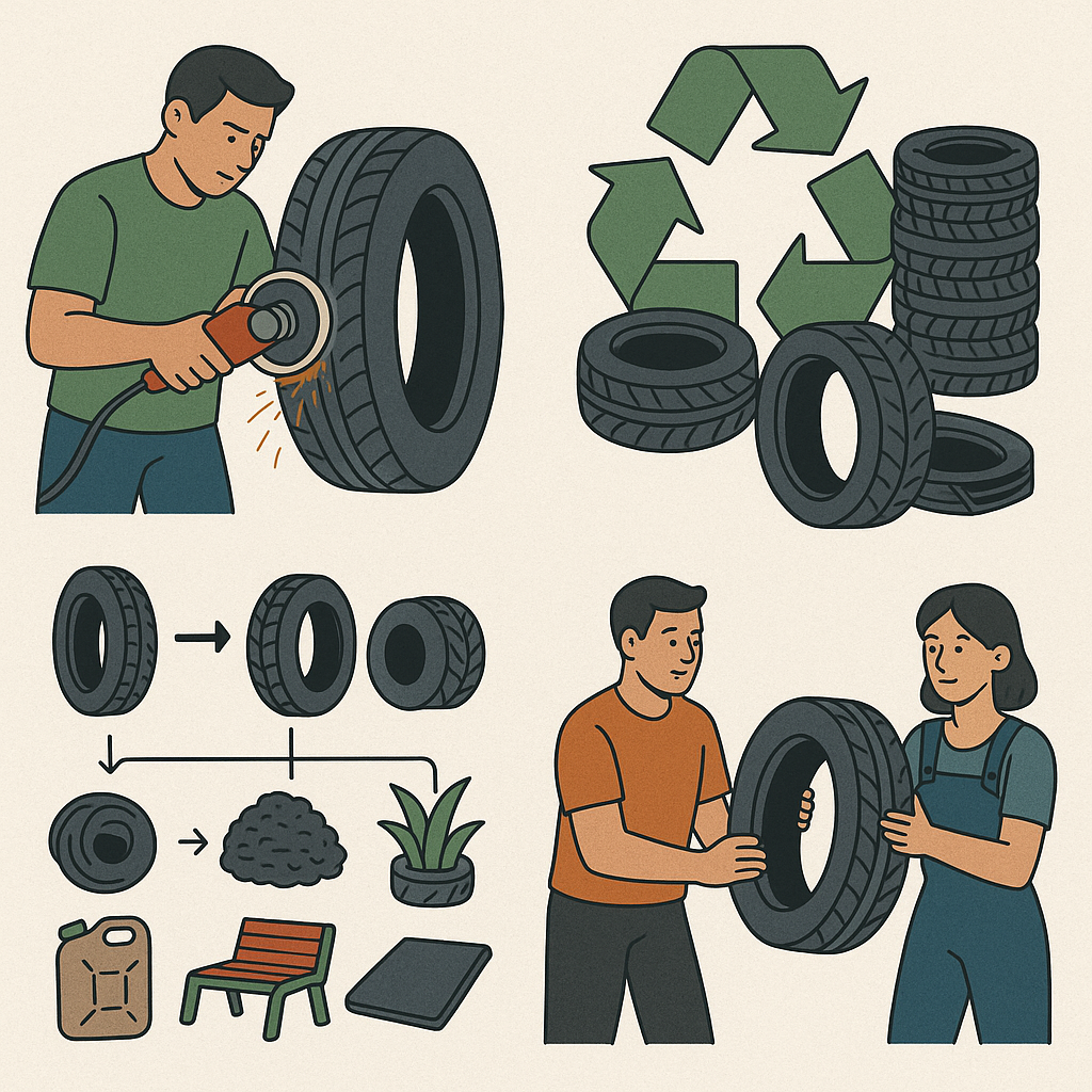 마모된 타이어는 표면을 깎고 새 트레드를 덧입혀 ‘재생 타이어’로 탈바꿈할 수 있으며, 벤치, 화분, 놀이터 바닥 등 업사이클링 제품으로도 변신합니다.