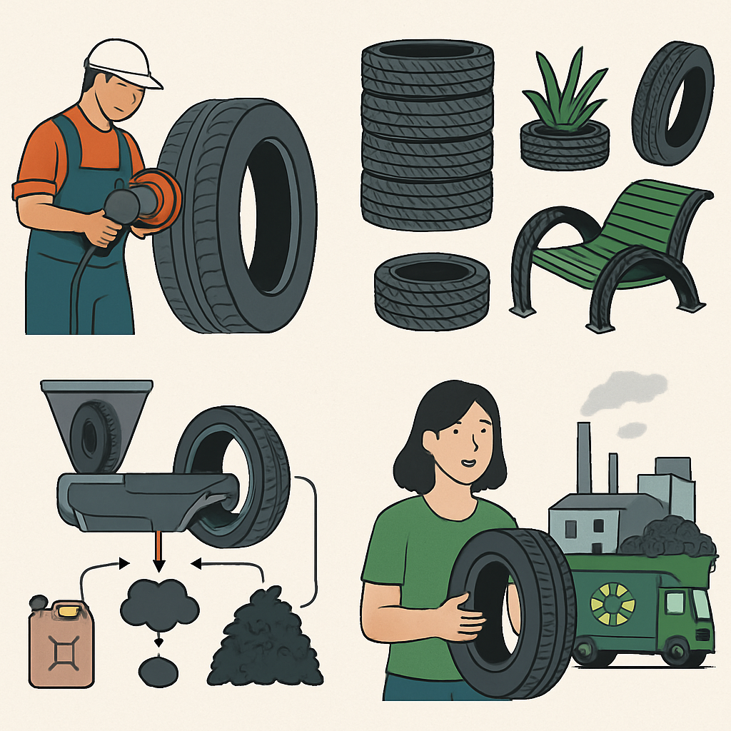 최근 주목받는 기술 중 하나는 열분해입니다. 폐타이어를 고온에서 분해해 연료유, 가스, 카본블랙 등으로 전환하는 방식으로, 산업 연료나 원료로 다시 활용됩니다. - 업사이클링 및 재생 타이어