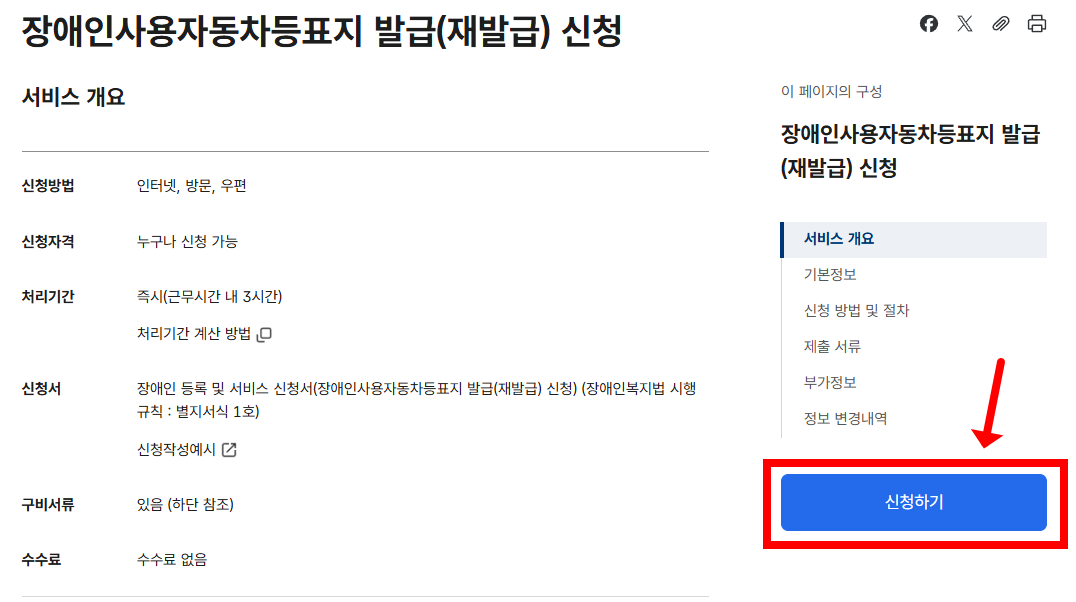 - ‘장애인사용자동차등표지 발급’ 검색하여 '신청하기' 버튼 클릭