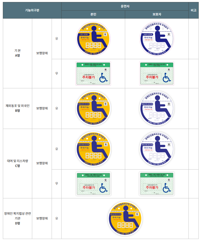 | 구분 | 운전자 | 보행장애 여부 | 표지 유형 |