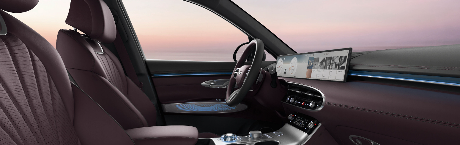 GV70 실내는 27인치 OLED 파노라믹 디스플레이, 프라임 나파가죽 시트, 크리스탈 변속 다이얼 등으로 미래지향적이면서도 섬세한 감성을 담아냈습니다.