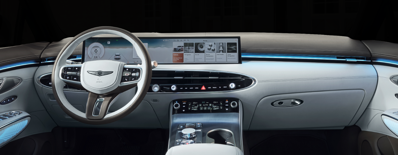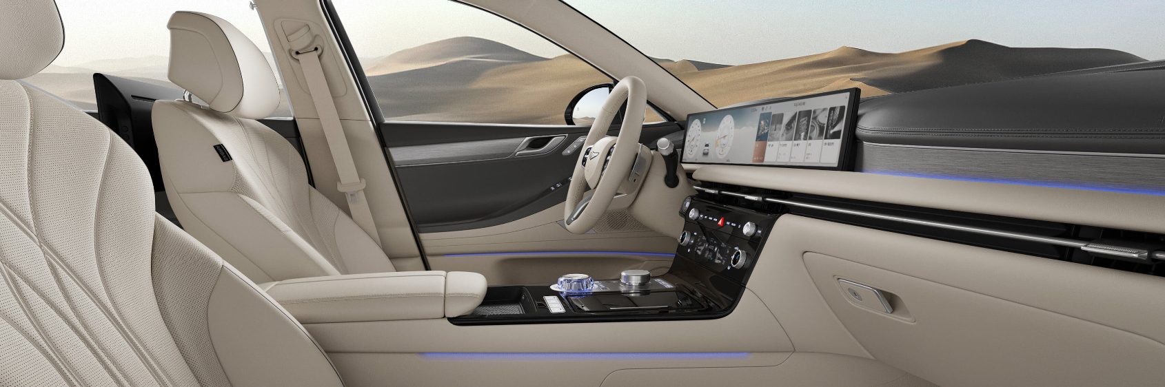 GV70 실내는 27인치 OLED 파노라믹 디스플레이, 프라임 나파가죽 시트, 크리스탈 변속 다이얼 등으로 미래지향적이면서도 섬세한 감성을 담아냈습니다.
