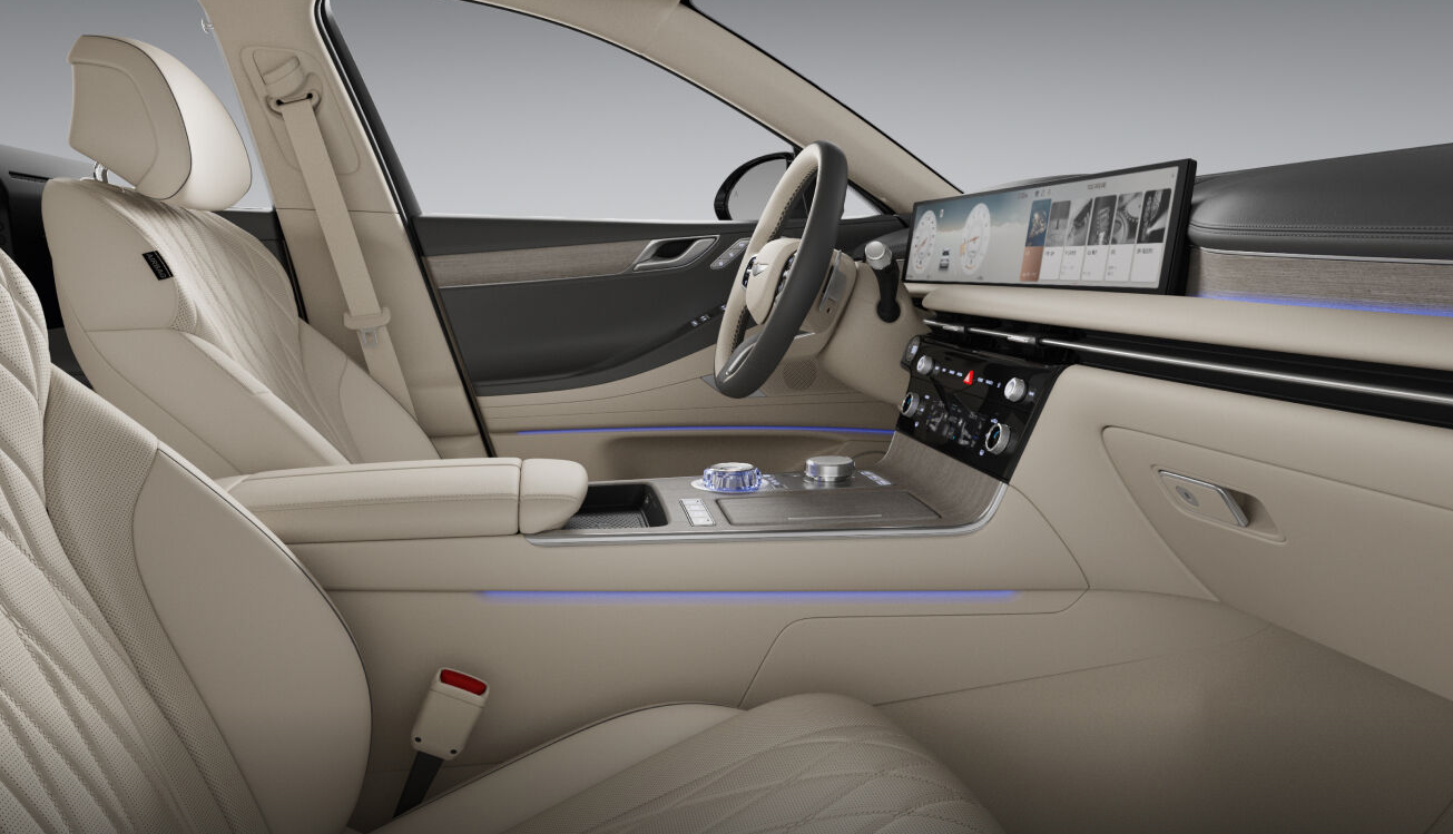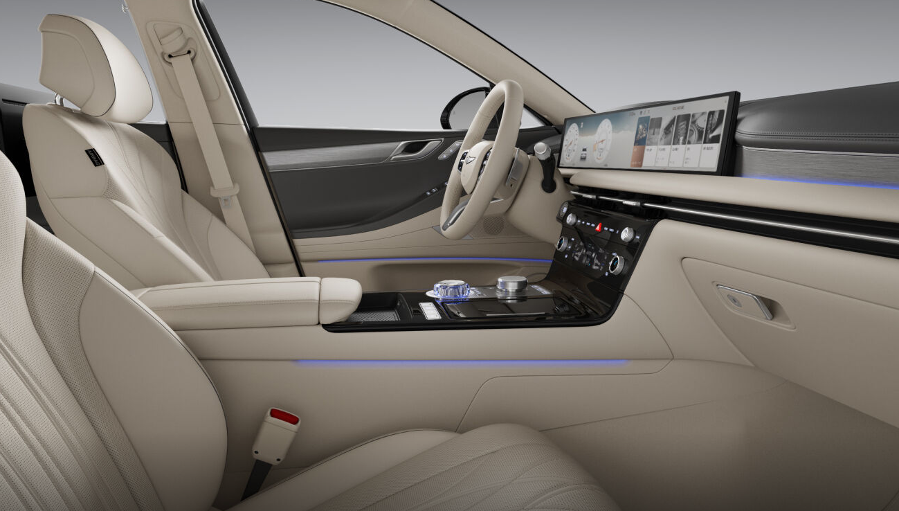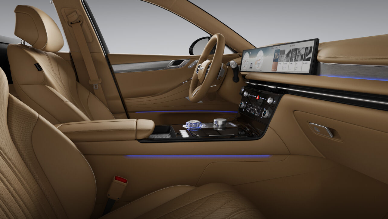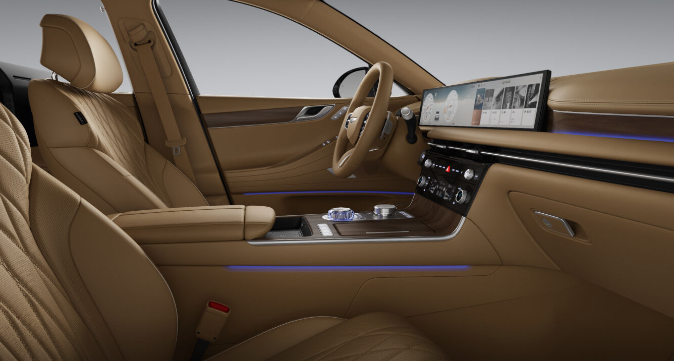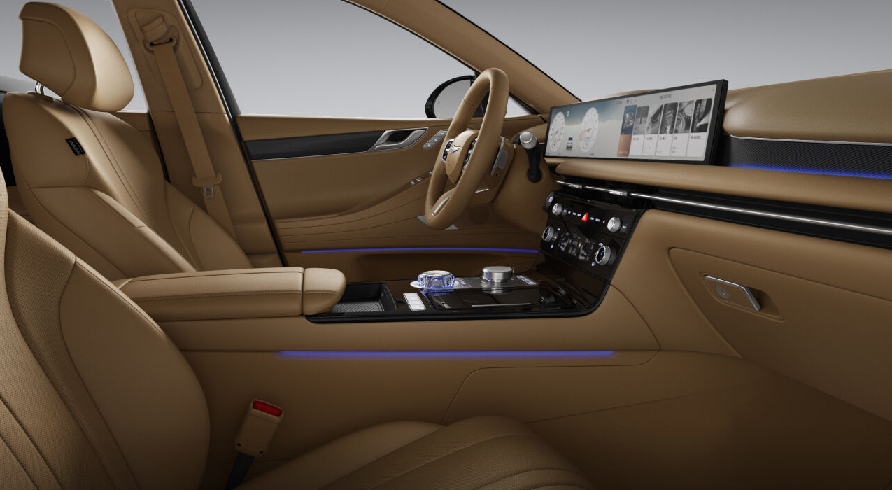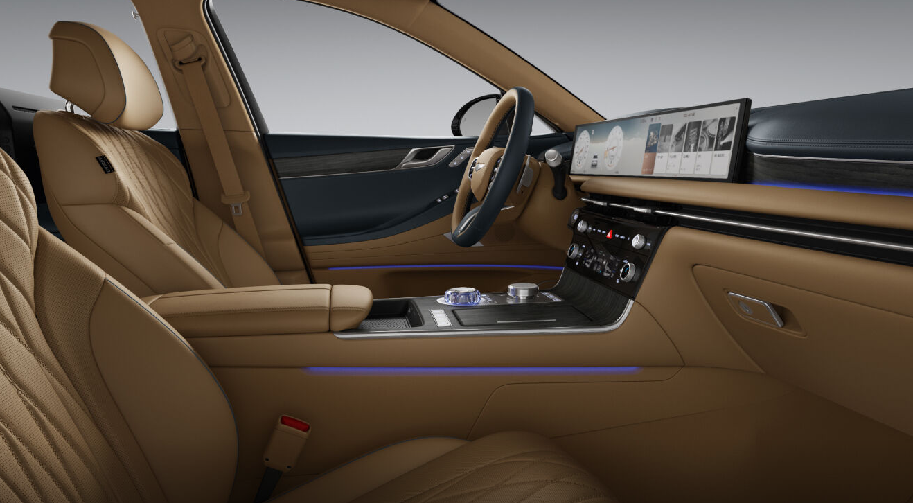 제네시스 G80의 스탠다드 디자인에는 단순히 블랙뿐 아니라 ‘에크루 카멜 모노톤’이라는 밝은 브라운 계열 인테리어도 함께 제공됩니다. 이 색상은 차분하고 따뜻한 분위기를 연출하며, 블랙 대비 시각적으로 더 넓고 부드러운 공간감을 줍니다.