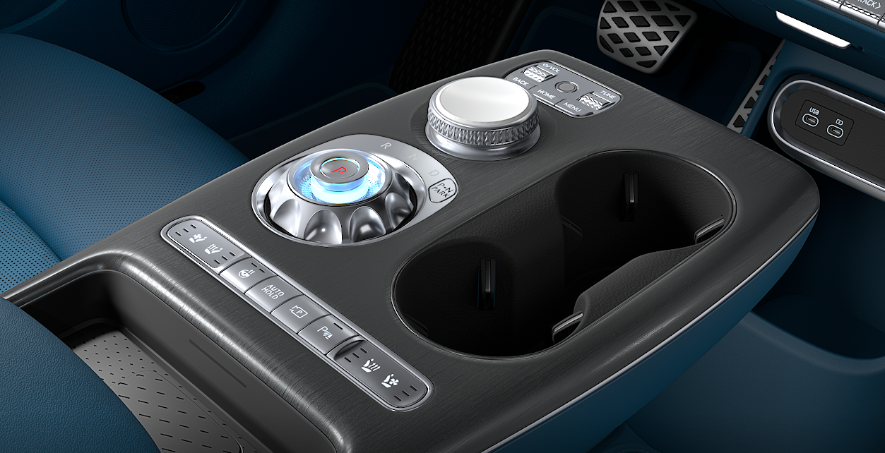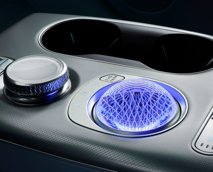 – 전자식 변속 다이얼로, 시동이 꺼졌을 때는 조명 장식처럼 보이다가 시동을 켜면 회전하며 변속기로 전환됩니다. 감성적이면서도 실용적인 요소로 많은 호평을 받고 있습니다. - 알루미늄 가니쉬와 패턴 디테일
