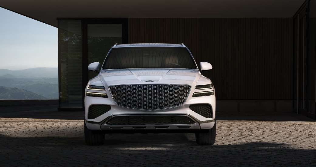 GV80의 외관 디자인은 '역동적인 우아함'을 콘셉트로 완성되었습니다. 전면부는 G-Matrix 패턴의 크레스트 그릴과 초슬림 MLA 헤드램프가 인상적이며, 측면은 파라볼릭 라인을 따라 우아하게 이어지는 실루엣이 특징입니다.