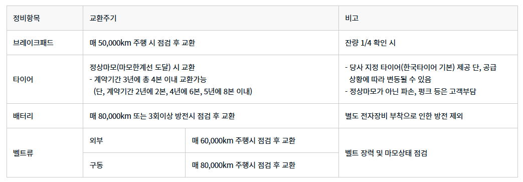 • 브레이크 패드: 평균 40,000km마다 교체. 30,000km 이하에서도 급제동이 많으면 수시 점검 필요.