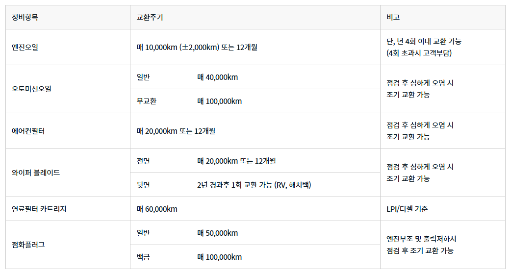 - 장수명 냉각수: 첫 교환 시기는 10년 또는 200,000km, 이후 2년/40,000km마다 점검.
