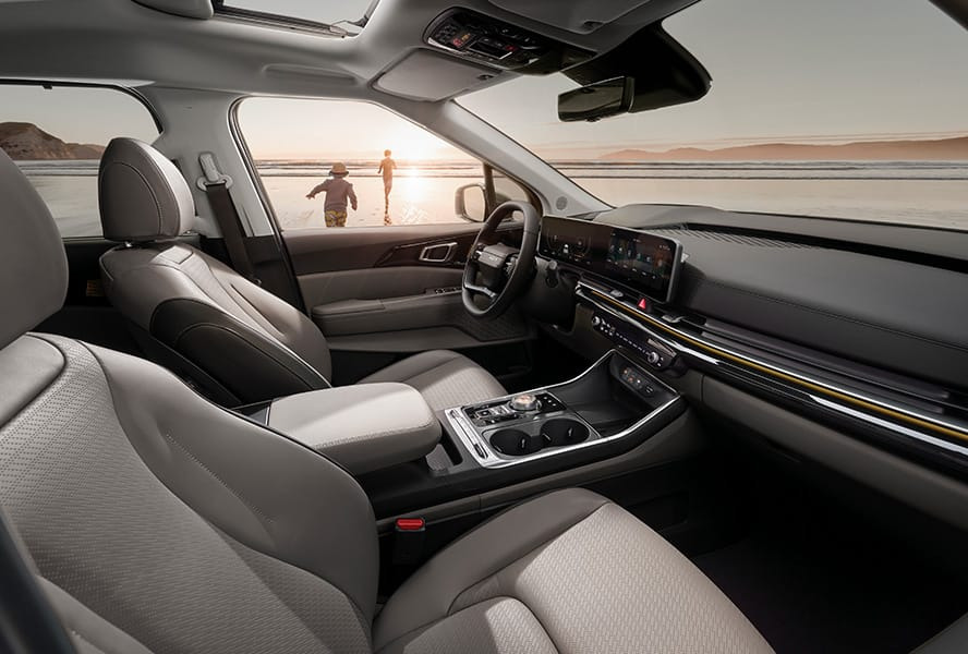 카니발 하이브리드는 ‘넓고 조용한 실내’가 장점이에요. 특히 하이브리드 전용 사양으로는 네이비 그레이 인테리어가 제공되어 일반 모델과 차별화된 느낌을 줍니다.