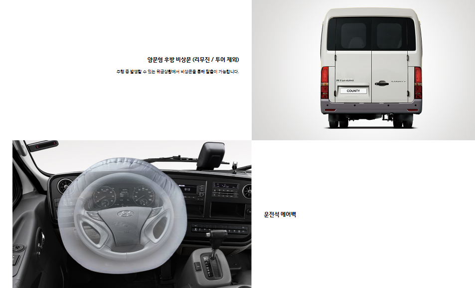 카운티 15인승은 외관상 버스처럼 보이지만, 운전면허는 1종 보통으로도 운행이 가능한 모델도 존재한다. 이 때문에 자가용 또는 가족용 셔틀로도 인기를 얻고 있다.