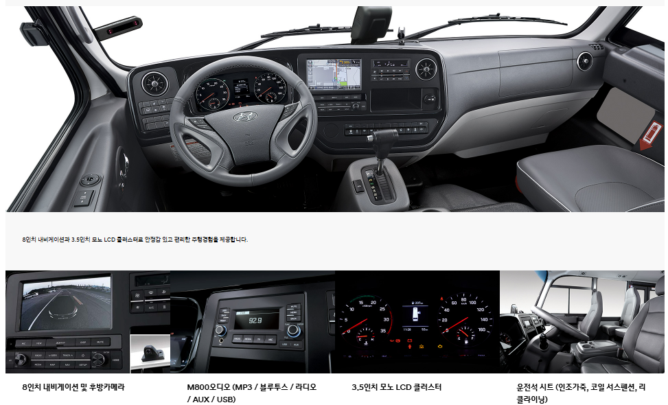 현대 카운티의 실내는 이전 세대와 비교해 큰 폭으로 개선되었다. 특히 운전석 중심의 인포테인먼트와 탑승자 편의 기능이 돋보인다.