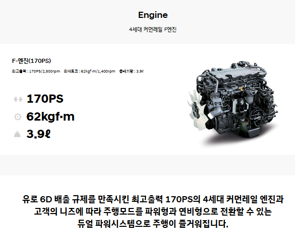 모든 디젤 카운티는 4세대 커먼레일 F-엔진(3.9ℓ)을 사용하며, 유로6D 배출가스 기준을 만족한다.