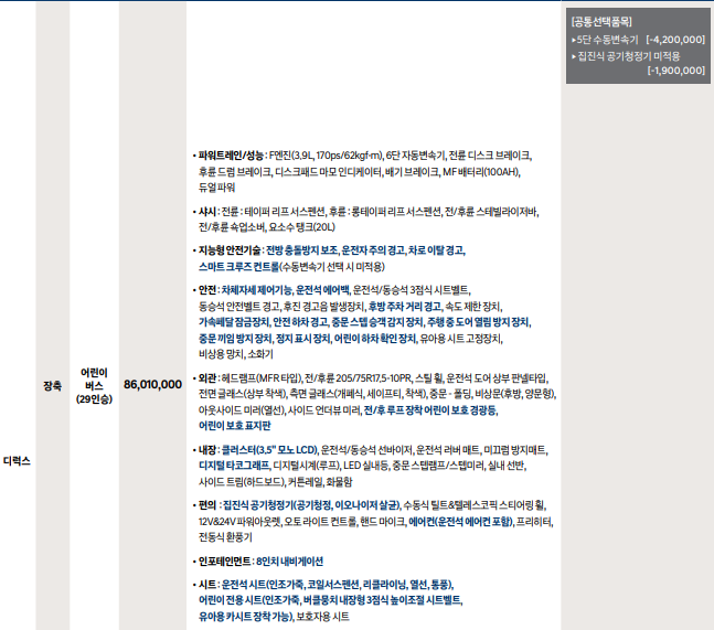 - 초장축 어린이버스(33인승): 8,636만 원