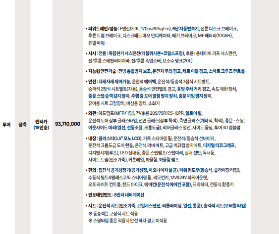- 15인승 투어 렌터카 모델: 약 9,181만 원