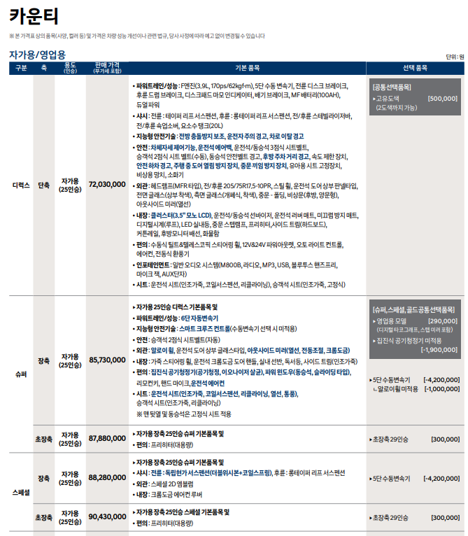 목적에 맞는 인승과 옵션을 고려해 가성비 높은 선택을 할 수 있도록 카운티 제원과 가격 정보를 꼼꼼히 정리해봤다.