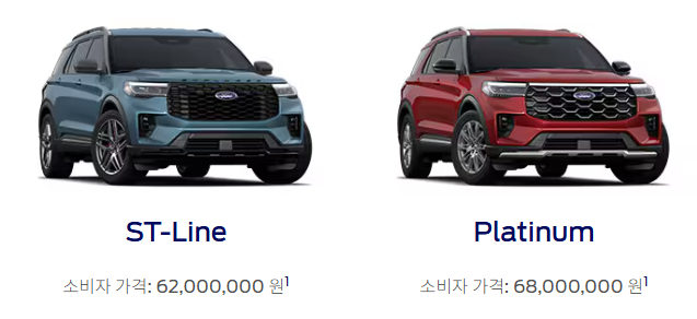2025 포드 익스플로러는 ST-Line과 Platinum 두 가지 트림으로 구성되어 있으며, 국내에서는 각각의 트림에 따라 가격 차이가 발생합니다. 실제 가격은 공식 홈페이지 또는 가까운 포드 딜러를 통해 확인하는 것이 가장 정확합니다. 참고용으로 ST-Line은 약 6,000만 원 중후반대, Platinum은 약 7,000만 원 중반대로 형성되어 있습니다.