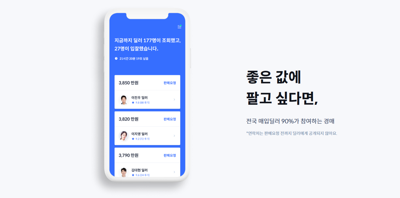 전문 평가사가 직접 차량을 확인하고, 딜러 경매를 대행해주는 서비스입니다. 판매자가 직접 발품을 팔지 않아도 높은 가격으로 차량을 판매할 수 있는 시스템이에요.