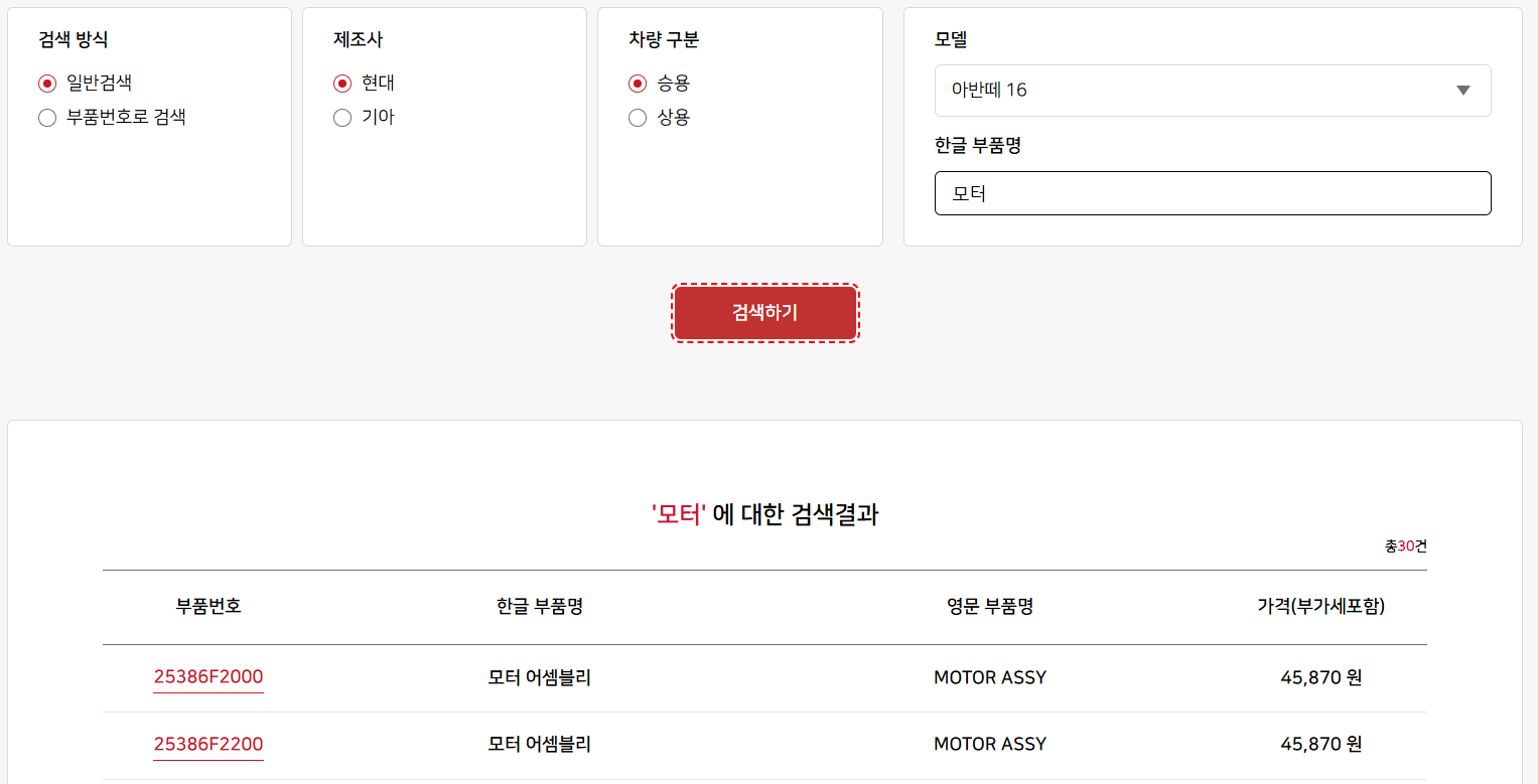 - 일반검색: 제조사(현대 또는 기아), 차량 구분(승용/상용), 모델명, 부품명을 입력해 검색하는 방식입니다.