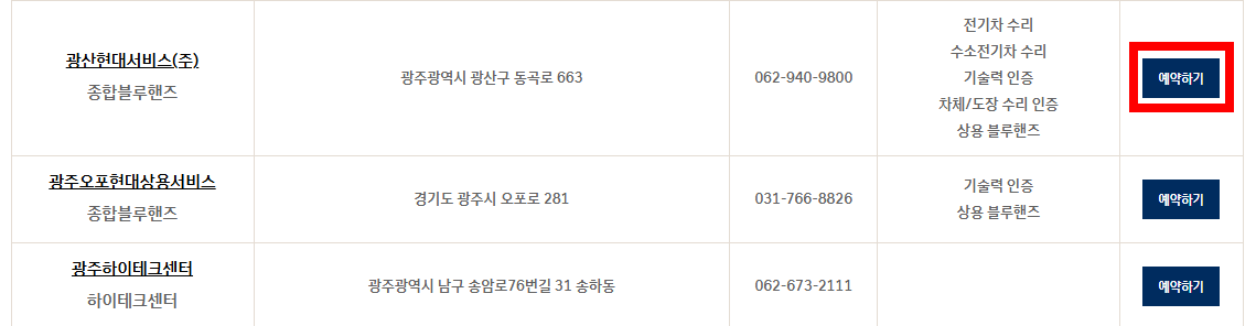 - 하이브리드, 전기차, 넥쏘의 고전압 배터리 수리나 리콜은 반드시 전화로만 예약이 가능하며, 일부 센터에서만 처리됩니다.