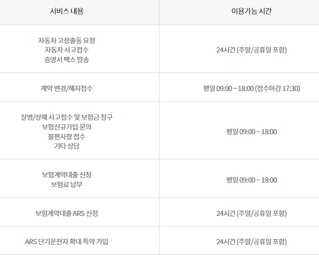 - 사고 접수 및 고장출동: 24시간 ARS 처리 가능